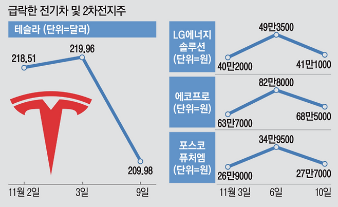 배터리 관련주들은 전기차 대장주 테슬라와 그동안 주가가 연동되는 경향이 강했다. 이런 가운데 테슬라조차 지난주 반짝 반등을 끝내고 이번 주 내내 주가가 지지부진한 모습을 보이자 동반 하락한 것이다.