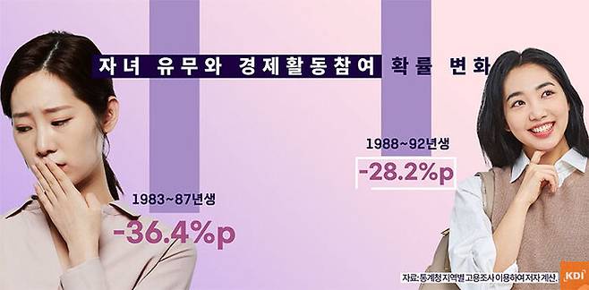 민지 씨 세대의 경제 활동 참가율이 영미 씨 세대보다 8.8%p 상승한 데에는 자녀가 있는 여성의 비중 감소(5.3%p)가 크게 기여한 것으로 나타났는데, 이는 자녀를 갖지 않거나 자녀를 갖는 시기를 미루는 여성이 증가한 것이 30대 여성의 경제 활동 참가율을 끌어올린 1차 요인이었다고, 한국개발연구원(KDI)는 분석했습니다.