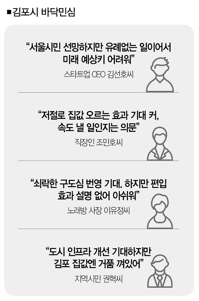 "김포가 서울에 편입한다는 구상이 현실화한다면, 당연히 좋지 않을까요. 사는 곳이 곧 신분이 되는 세상인데 어쨌든 김포시민에서 서울특별시민이 되는 거니까요. 김포시민을 대상으로 한 설문조사 결과도 당연히 긍정이 우위일 거라고 봐요."