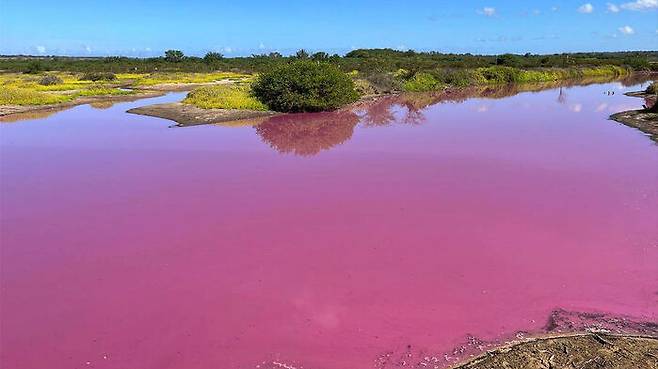 현지 시간 10일 미국 어류·야생동물관리국(USFWS)에 따르면 하와이 마우이섬의 케알리아 연못 국립 야생동물 보호구역 직원들이 지난달 30일부터 분홍색으로 변한 연못 물을 모니터링하고 있습니다.