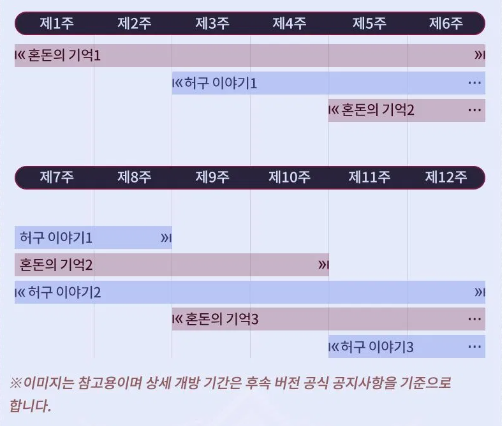또한 혼돈의 기억 각 회차 개방 기간이 2주에서 6주로 연장된다. 새로운 혼돈의 기억이 오픈된 상태에서도 기존 혼돈의 기억을 진행할 수 있다는 의미다. 허구 이야기 개방 기간에도 혼돈의 기억은 그대로 오픈된 상태로 남아있다.