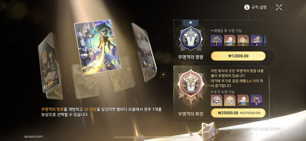 1.5 버전부터 기존 무명객의 영광 50레벨 보상에 배치된 성옥 680개는 무명객의 영광 개방 시 즉시 획득할 수 있다. 해당 자리에는 자가 변형성 레진 1개가 추가된다.