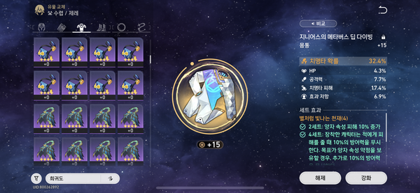 캐릭터에 따라 사용률이 높은 유물 세트 및 메인 속성을 참고할 수 있다.