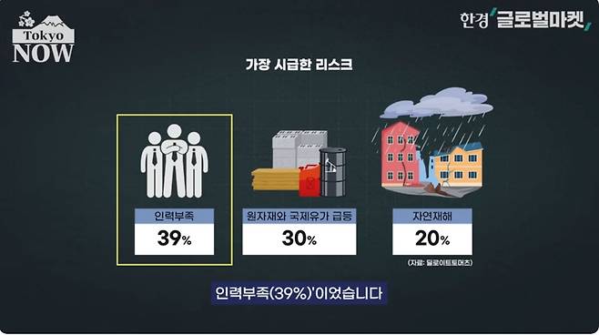 '원자재와 국제 유가 급등(30%)', '이상기온, 대규모 자연재해(20%)'가 뒤를 이었다. 지난 조사에서는 자연재해가 1위였다. 그렇다면 자연재해보다 무서운 인력난을 일본 기업들은 어떻게 대응하고 있을까. 인구감소의 역습이 시작됐다⑤에서 계속