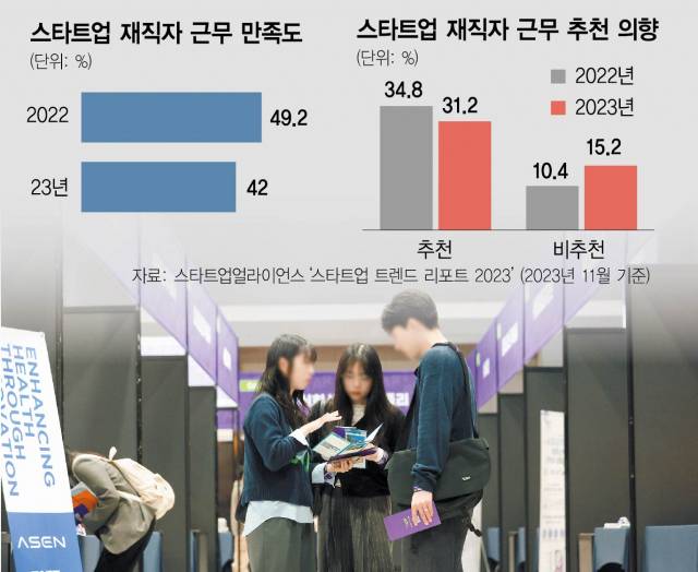 다만 업력이 짧은 스타트업 입사에 대한 선호도는 떨어지는 추세로 파악됐다. 스타트업의 자금력이 떨어지자 근무 여건에 비해 연봉, 복지 등에 대한 불만이 높아졌기 때문으로 분석된다. 실제 스타트업 얼라이언스가 최근 공개한 '스타트업 트렌드 리포트 2023'에 따르면 스타트업 근무 만족도를 묻는 질문에 재직자의 42%가 ‘만족한다’고 답해 지난해 49.2% 보다 7.2%포인트 떨어졌다. 스타트업 재직자 중 ‘스타트업 근무를 추천할 의향이 있다’고 답한 비율은 31.2%로 전년 보다 3.6%포인트 줄었다. 반면 ‘추천하지 않는다’는 15.2%로 전년 10.4%에서 급상승했다. 한 스타트업 재직자는 "스타트업 80%는 투자 유치 실패, 혁신 소멸 등으로 1~2년 안에 없어지는 게 현실"이라며 “최근 시장 상황이 어려워지면서 유니콘 급의 기업조차도 대량 권고 사직을 실시하는 것을 보니 스타트업 취업을 추천하기 어렵다”고 전했다.