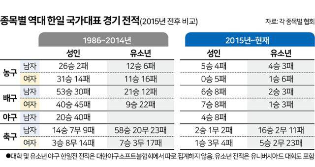 미래도 어둡다. U-16(16세 이하) 등 여자 농구 연령별 대표팀들은 2015년 이후 일본과 7번 맞붙어 6번 졌다. 남자 배구(2승 3패·승률 40.0%)와 여자 배구(1승 3패·25.0%), 여자 축구(5승 2무 23패·17.9%)도 열세를 면치 못하고 있다.