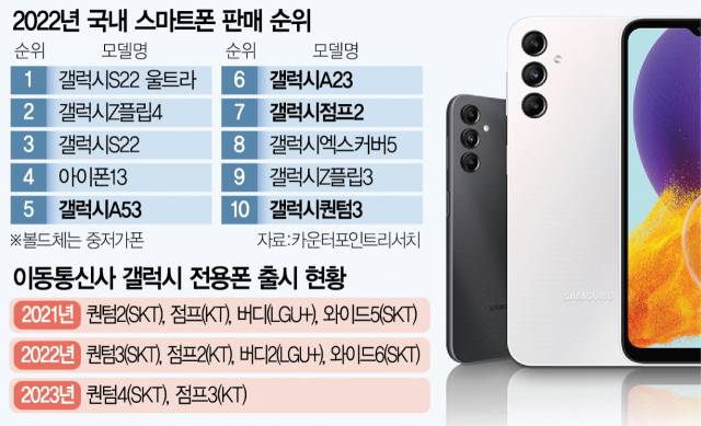 삼성전자 ‘갤럭시A’ 시리즈나 변형 제품 일부가 매년 SK텔레콤의 ‘갤럭시 퀀텀’과 ‘갤럭시 와이즈’, KT의 ‘갤럭시 점프’, LG유플러스의 ‘갤럭시 버디’ 같은 통신사 전용폰으로 나온다. KT가 통신비 인하를 위해 10일 출시한 ‘갤럭시 점프3’를 포함해 올해 삼성전자 중저가 신제품 5종 중 2종이 전용폰으로 나왔다. 지난해와 2021년에도 각각 중저가폰 8~9종 가운데 절반 가까이가 전용폰이었다. 이런 추세를 감안하면 내년 상반기 출시 예정인 3~4종 중 적어도 1종은 통신사 전용폰이 될 것으로 보인다.