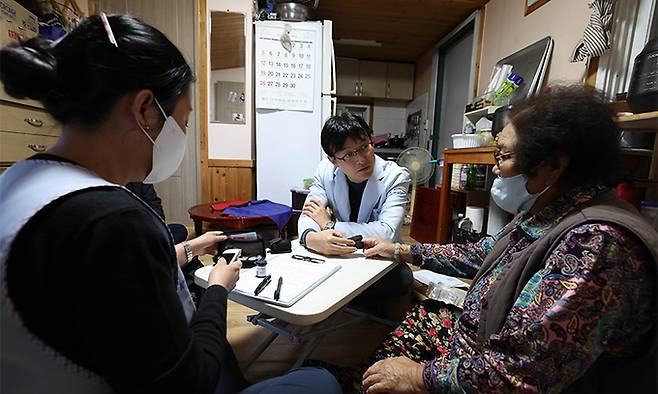 | 안부까지 물으며 ‘따뜻한 진료’ 강원 춘천시 유일의 왕진 의사 양창모 호호방문진료센터 원장(가운데)과 최희선 간호사(왼쪽)가 7일 동면 신이리 소양강댐 수몰지역 한금자(80)씨 집 거실에서 한씨의 혈당과 혈압을 확인하며 방문진료를 하고 있다. 비교적 간단한 무릎 관절염 치료만 진행된 한씨 진료에는 30여분이 걸렸다. 다른 아픈 곳은 없는지, 못 만난 사이 무슨 일이 있었는지를 세세하게 묻고 답하며 이들은 이날 일반 한국 병원 진료실에서 좀체 경험할 수 없는 의료 서비스를 보여줬다. 춘천=남정탁 기자 |