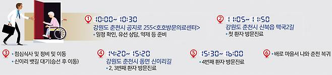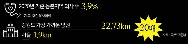 시골에선 이동할 수 있어도 병원 찾는 일은 여간 어려운 게 아니다. 대한의사협회에 따르면 2020년 기준 전체 의사인력 중 농촌지역 의사 수는 3.9%에 불과했다. 춘천이 속한 강원도의 경우 같은 해 국토교통부가 분석한 결과 가장 가까운 병원까지 도로 이동거리가 22.73㎞로 서울 1.97㎞의 20배가량 됐다.