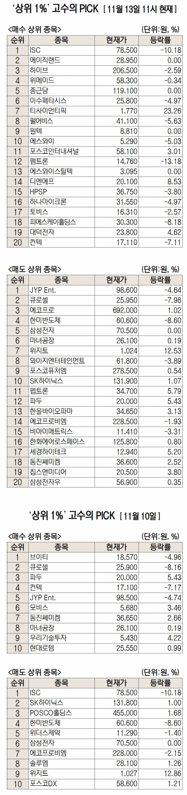 이날 미래에셋엠클럽에 따르면 미래에셋증권 주식 거래 고객 중 최근 1개월 간 투자수익률 상위 1%에 해당하는 ‘주식 초고수’들이 오전 11시까지 가장 많이 사들인 종목은 ISC로 집계됐다.