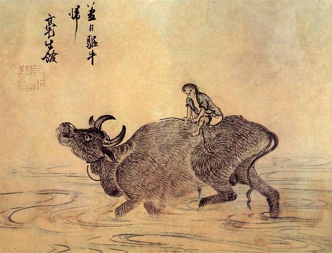 힘차게 고개를 위로 쳐들고 물을 건너는 황소와 그 위에 앉아 채찍을 두 손으로 잡고 떨어지지 않으려 몸을 구부린 목동이 있다. 두 눈 사이가 멀어서인지 소년의 표정이 다소 익살스럽고 해학적으로 보인다. 소털 하나하나의 올을 매우 굵게 그렸고, 소의 다리를 중심으로 일어난 물결이 생생하다.