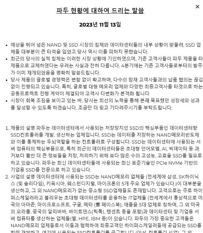 13일 금융투자업계에 따르면, 파두 측은 이날 자사 홈페이지에 "예상치 못한 NAND(낸드) 및 SSD(솔리드스테이트드라이브) 시장 침체로 고객의 발주가 중단된 것이 이번 3분기 실적 쇼크의 직접적인 원인"이라며 "우리도 이를 피하지 못했다"고 해명했습니다.