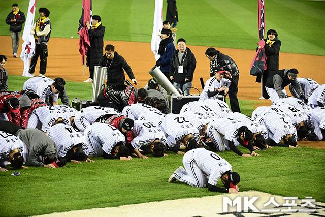 ‘통합우승’ LG ‘29년 기다려준 팬들에게 큰 절’ [MK포토]