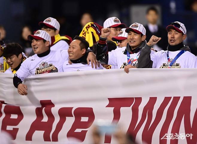 13일 서울 잠실야구장에서 열린 ‘2023 KBO 포스트시즌’ KT 위즈와 LG 트윈스의 한국시리즈 5차전 경기에서 6-2로 승리하며 통합 우승을 차지한 LG 염경엽 감독과 오지환이 응원가를 부르고 있다. 잠실 | 주현희 기자 teth1147@donga.com