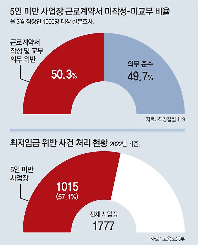 최저임금을 지키지 않는 사업장도 많았다. 고용노동부가 지난해 신고받아 처리한 최저임금법 6조(최저임금 지급 의무) 관련 사건은 1777건이었는데, 이 중 1015건(57.1%)이 5인 미만 사업장에서 발생했다. 급여 수준은 물론이고 휴게시간 보장 등 근로 여건, 심지어 급여 지급 기한 준수와 같은 기본적인 근로기준법상 준법 사항조차 지키지 않은 곳이 많았다.