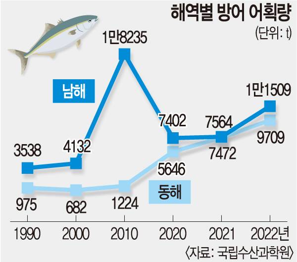 13일 국립수산과학원에 따르면 최근 기후변화의 영향을 뚜렷하게 받은 어종은 방어와 살오징어다. 방어의 어획량은 1990년 4532t에서 지난해 2만1250t까지 늘었다. 하지만 더 이상 남해가 방어의 주 어장이라고 보기는 어렵다. 1990년 방어 어획량 중 남해 비중은 77%였다. 동해와 남해의 격차는 2010년대 후반 줄어들기 시작했다. 2018년 동해의 방어 어획량 비중은 68%로 남해(32%)의 2배에 이르기도 했다. 지난해 방어 어획량 비중은 동해와 남해가 각각 46%, 54%였다. 동해와 남해에서 절반씩 잡히는 셈이다.