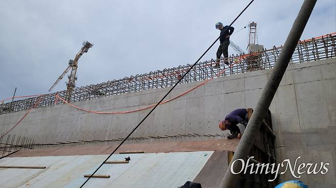 | ▲ 철근공들이 높은 단부 옆에서 기둥 철근 작업을 하고 있다. |