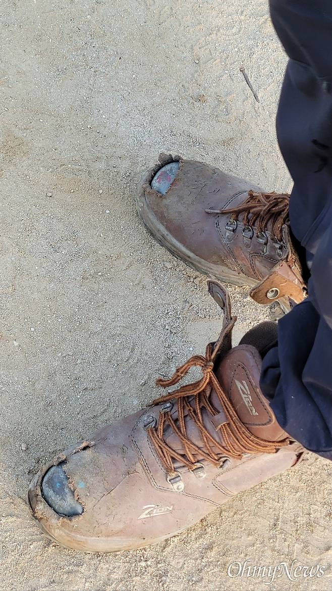 | ▲ 한 철근공의 구멍 나고 헤진 안전화. |