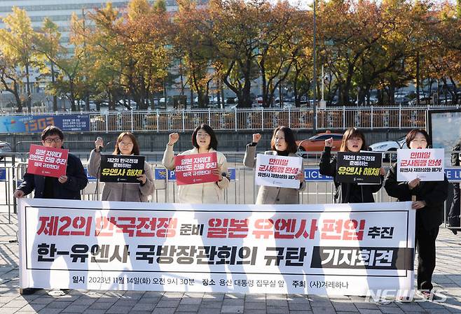 [서울=뉴시스] 김진아 기자 = 겨레하나 관계자들이 14일 서울 용산 대통령 집무실 앞에서 제2의 한국전쟁 준비, 일본 자위대 유엔사 편입 추진 한-유엔사 국방장관회의 규탄 기자회견을 하고 있다. 2023.11.14. bluesoda@newsis.com