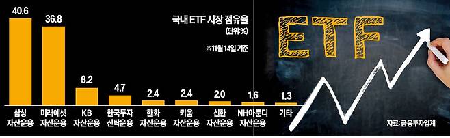 자산운용업계에 상장지수펀드(ETF) 브랜드 교체 바람이 불고 있다. 국내 ETF 시장을 양분하는 삼성자산운용 KODEX(40.6%)와 미래에셋자산운용(36.8%) TIGER에 맞서기 위해 후발 업체들이 대표 상품의 간판까지 바꾸려는 것이다.