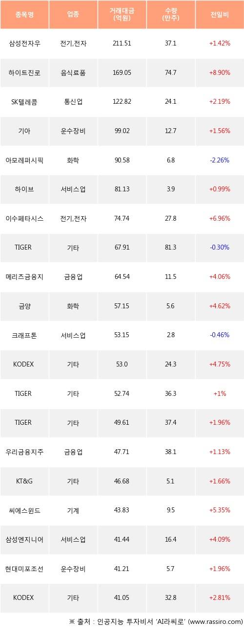 삼성전자우, 하이트진로, SK텔레콤 등은 전일 대비 주가가 상승했고, 아모레퍼시픽, TIGER 차이나전기차SOLACTIVE, 크래프톤 등은 주가가 하락했다.