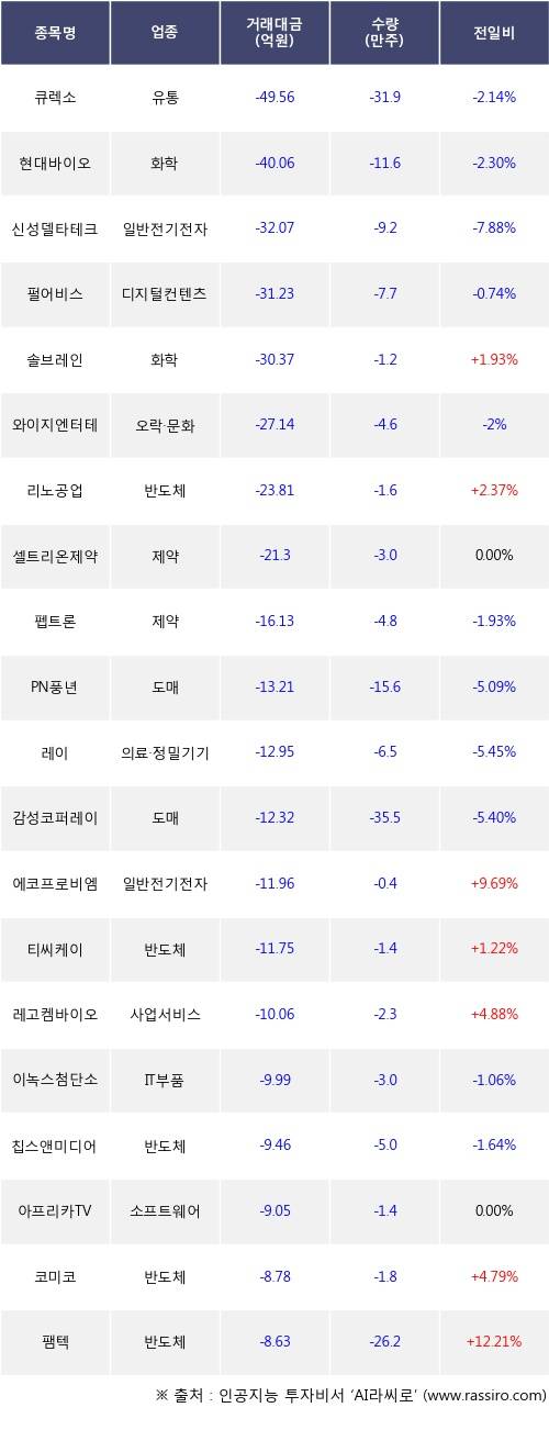 외국인 투자자의 순매도 상위 20개 종목은 큐렉소, 현대바이오, 신성델타테크, 펄어비스, 솔브레인, 와이지엔터테인먼트, 리노공업, 셀트리온제약, 펩트론, PN풍년등이다.