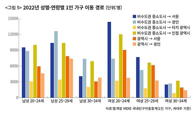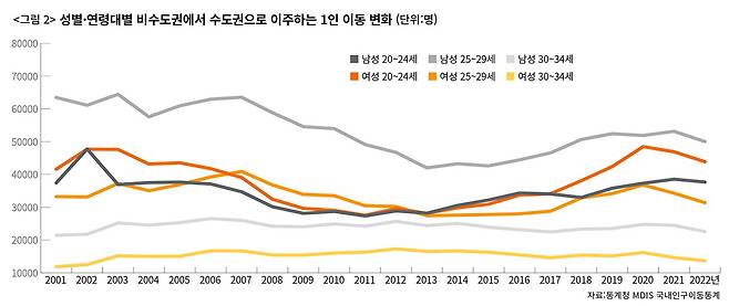 이번에는 이동의 범주를 조금 달리 설정해보자. 비수도권에서 수도권 전역으로 이동하는 청년인구의 흐름은 어떨까? 〈그림 2〉에서 그것을 확인해볼 수 있다. 서울만 놓고 본 〈그림 1〉과 큰 흐름은 비슷하다. 2010년대 중반부터 남녀 모두 20대 1인 이동이 수도권으로 몰리고 있다. 이 중에서도 20~24세 여성의 수도권 이주가 가장 가파르게 상승하는 모습을 보인다.