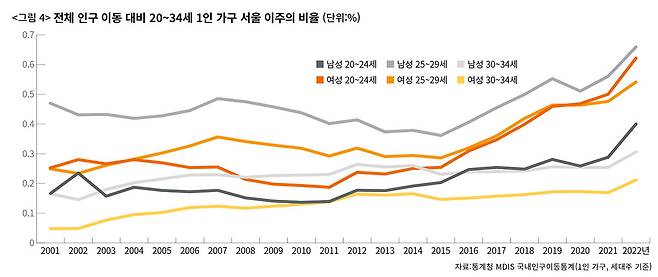 〈그림 4〉를 함께 살펴보자. 전체 이동 인구 대비 20~34세 1인 가구 서울 이주의 비율을 성별, 나이대별로 그린 그래프다. 2015년 서울로 이주한 20~24세 여성은 전체 이동 인구의 0.35%에 그쳤다. 그러나 이 비율은 2010년대 후반부터 크게 높아져 두 배 수준인 0.72%까지 늘었다. 같은 기간 25~29세 여성의 서울 이주 비율도 0.38%에서 0.64%로 증가했다. 전국에서 일어나는 모든 인구이동 가운데 1.36%가 20대 여성이 혼자 자취하기 위해 서울로 향하는 이주다. 언뜻 큰 숫자가 아닌 것 같지만, 이 비중이 점차 늘고 있다는 점은 눈여겨볼 법하다.