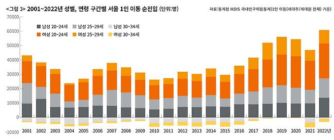20대 여성의 서울 쏠림은 여러 후폭풍을 낳는다. 특정 세대, 특정 연령대의 공간적 쏠림은 세대 간, 성별 간 불평등에도 영향을 미친다. 서울에서 1인 가구로 거주하는 것은 상당한 비용을 수반한다. 높은 주거비와 물가를 오롯이 개인이 감당해야 하기 때문이다. 서울에 일자리가 많다고 해서 그 일자리들이 안정적일 것이라는 보장도 없다. 20대 여성들이 많이 진출하는 각종 서비스 일자리, 특히 IT, 콘텐츠, 서비스 업종의 경우 이직이 잦고 비정규직도 상당하다. 높은 생활비를 감당하면서 안정적으로 자산을 형성하기란 쉽지 않다. 그래서 세대 간, 성별 간 자산 불평등은 시간이 지날수록 심화될 우려가 있다.