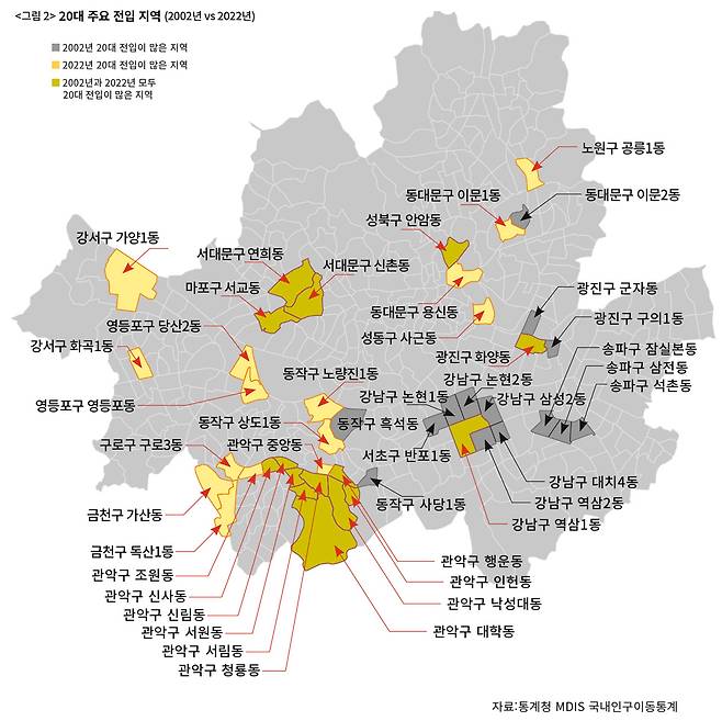 이렇게 서울로 이주한 청년들은 과연 서울의 어느 동네로 가고 있을까. 지난 20년 동안 이들이 서울로 진입한 뒤 이주하는 공간적 패턴도 크게 변했다. 〈그림 2〉는 서울로 혼자 이동한 20대들이 주로 자리 잡은 행정동 상위 30개 지역을 표시했다. 그림 속에서 회색 음영으로 표기된 부분은 2002년 청년들이 자주 찾은 지역이다. 현 대학동인 관악구 신림9동, 강남구 역삼1동, 강남구 논현1동, 서초구 반포1동 등이 주요 지역이다. 이때 흥미로운 점은 당시만 해도 처음 서울로 이주해온 1인 가구 상당수가 강남과 그 인근 권역에 위치해 있다는 것이다. 그러나 20년이 지난 뒤, 이러한 공간 배치는 달라진 모습을 보여준다.