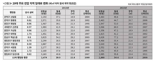 월세는 오르고, 집은 좁아졌으며, 여성은 더 비싼 계산서를 받는다. 〈그림 3〉을 함께 살펴보자. 2012년과 2022년, 동일한 행정동의 40㎡ 이하 단독·다가구, 연립다세대, 오피스텔, 아파트의 동별 월세 계약 실거래가 평균을 계산한 자료다. 지난 10년 동안 서울로 이주한 1인 가구의 생활비 변화를 간접적으로 엿볼 수 있는 지표다. 전체적으로 면적은 약간 줄었고, 월세는 비싸졌다. 집의 연식은 그나마 나아졌지만, 10년간 시간차를 감안하면 꼭 그렇다고 보기도 어렵다.