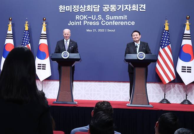 | ▲ 질문 받는 한미 정상 2022년 5월 21일 윤석열 대통령과 조 바이든 미국 대통령이 서울 용산 대통령실 청사 대강당에서 열린 한미정상 공동기자회견에서 질문받고 있다. |