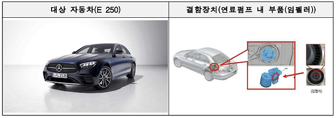 벤츠코리아의 E250 등 14개 차종 9천528대는 연료펌프 내 부품 결함에 따라 연료공급이 이뤄지지 않아 시동이 꺼질 가능성이 발견됐습니다.