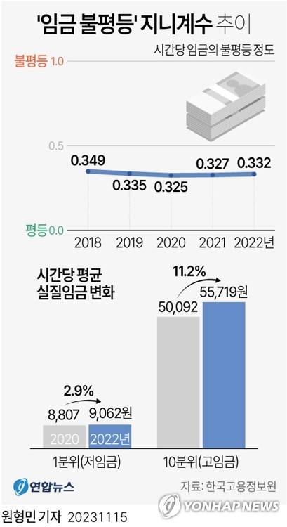 (서울=연합뉴스) 원형민 기자 = 15일 한국고용정보원의 고용동향 브리프 '최근 임금 격차 특징과 원인' 보고서에 따르면 고용노동부의 고용형태별 근로실태조사 자료를 활용해 2008∼2022년 시간당 임금 격차 추이를 분석한 결과 시간당 임금의 불평등 정도를 계수화한 지니계수는 2022년 0.332로 나타났다.