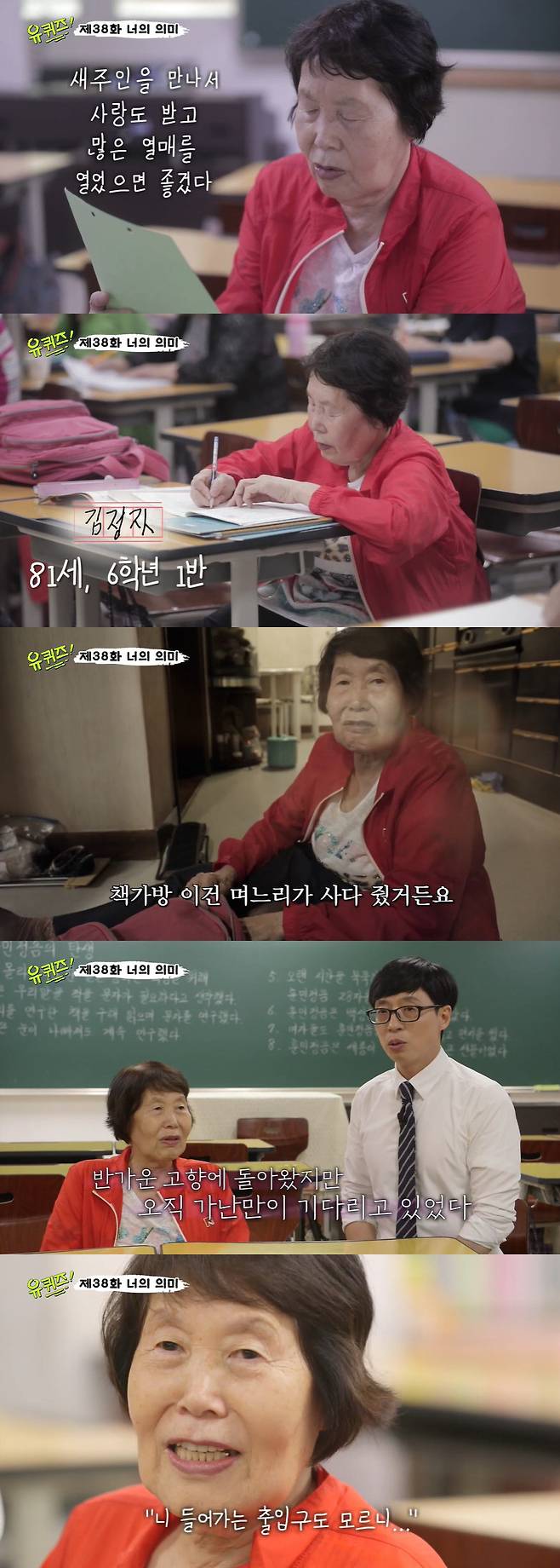 학교에 다닌 후 인생이 바뀌었다는 김정자 할머니는 "모든 게 다 즐겁고 하나하나 아는 거에 눈을 뜨니까 너무 좋다. 내 이름도 모르고 학교 문턱도 모르고 8남매 맏딸로 태어나서 너무 힘들게 살던 차에 6·25 전쟁이 터져서 거제로 피난을 갔다. 다시 고향이 왔더니 집도 불에 타버렸다. 학교 갈 생각은 하지도 못했다"고 털어놨다.