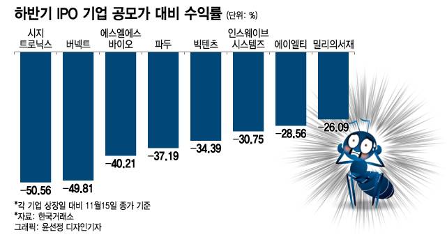 15일 한국거래소에 따르면 스팩 및 합병상장 등을 제외한 하반기 IPO 기업 총 38개 중 21개의 주가가 공모가 밑으로 떨어진 것으로 나타났다. 절반 이상이 떨어진 것인데 시지트로닉스(-50.56%), 버넥트(-49.81%), 에스엘에스바이오(-40.21%), 파두(-37.19%), 빅텐츠(-34.39%) 순으로 하락폭이 컸다.