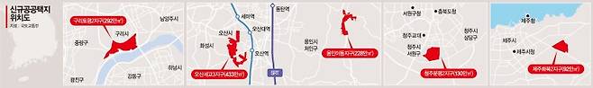 15일 국토교통부는 전국 5곳에 8만가구 규모의 신규 택지 후보지를 발표했다. 수도권은 △구리토평2지구(1만8500가구) △오산세교3지구(3만1000가구) △용인이동(1만6000가구) 등 3곳에 6만5500가구를 조성한다. 비수도권은 청주분평2지구(9000가구)·제주화북2지구(5500가구) 등 2곳에 1만4500가구가 들어설 예정이다.