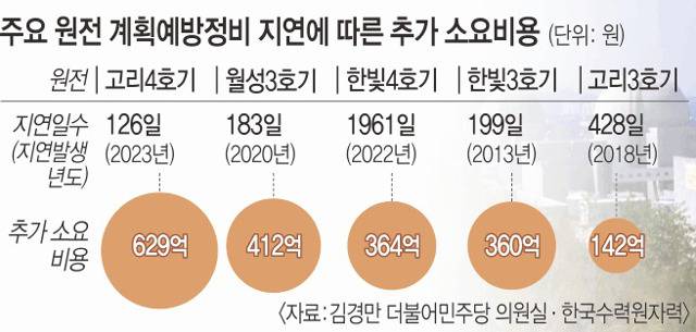 월성 3호기는 2019년 9월부터 10월까지 계획예방정비를 하기로 예정돼 있었다. 그러나 증기발생기 습분 분리기 교체가 지연되면서 이듬해 4월에서야 정비가 마무리됐다. 한 달로 계획됐던 정비 작업 비용은 259억원으로 예상됐지만, 정비 기간이 늘어지면서 412억원이 추가로 지출됐다. 한빛 3호기도 2018년 5월부터 7월까지 정비가 예정돼 있었지만 격납건물 철판 점검에 시간이 더 들어 2020년 11월에서야 정비가 끝났다. 이에 따라 290억원이 더 투입됐다.