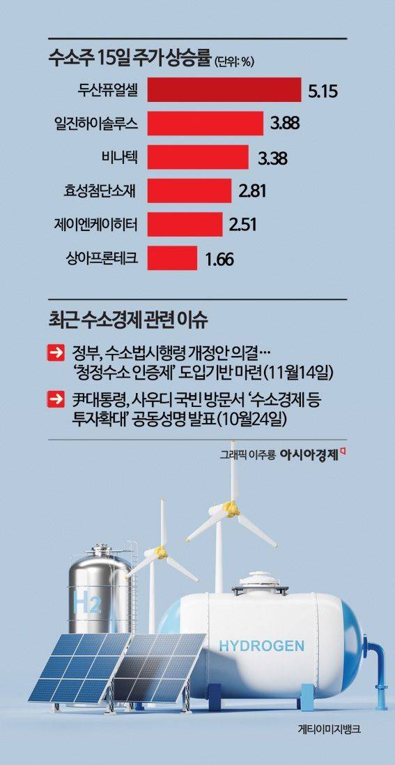 윤석열 대통령이 사우디아라비아 국빈 방문에서 양국의 수소경제 협력을 약속하고, 정부가 국내 청정수소 인증제를 개선하는 등 호재가 잇따르면서 움츠렀던 '수소 관련주'가 재조명받고 있다.