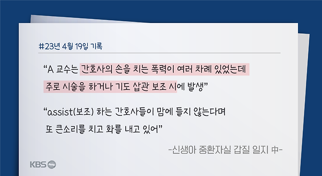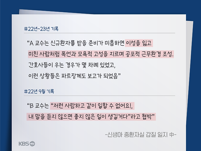 "신생아 중환자실 내부에서, 의료행위를 하고 있었어요. 잘못한 게 하나도 없는 상황에서 B 교수가 소리를 지르면서, "하지 마시라고요!"라고 고성을 내며 분위기를 험악하게 만들었어요."