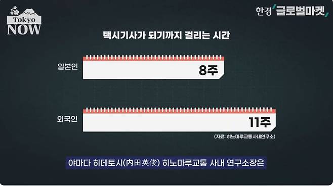야마다 히데토시 히노마루교통 사내 연구소장은 "일본인이 면허를 따서 택시 업무를 시작하기 까지 걸리는 시간이 평균 8주인 반면 외국인은 11주가 걸린다. 11주도 중국인 같은 한자 문화권 출신을 합한 평균 기간으로 비한자문화권 출신자는 시간이 더 걸린다"고 설명했다.