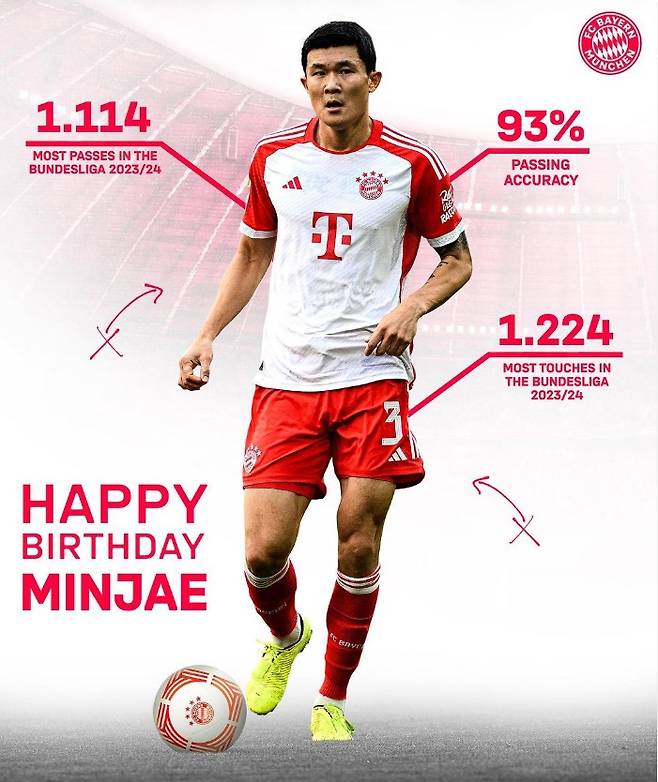 뮌헨은 김민재의 경이로운 2023/24시즌 스텟도 선보였다. 올시즌 김민재는 패스 성공률 93%를 기록했으며, 패스 횟수(1,114회)와 터치 횟수(1,224회) 부문에서 분데스리가 선수들 중 1회를 달성했다.