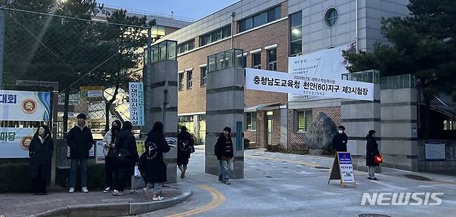 [천안=뉴시스] 박우경 기자=16일 오전 2024학년도 대학수학능력시험 충남교육청 천안 60지구 제 3시험장 천안오성고에서 시험을 치르는 수험생들이 들어서고 있다. 2023.11.16. photo@newsis.com