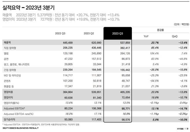 지난 2일 하이브가 발표한 2023년 3분기 잠정 실적에 따르면, 하이브는 5379억원의 매출을 기록했다.