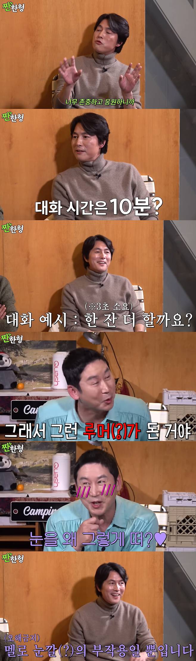 신동엽은 정우성에게 "이정재가 '오징어 게임' 대박 났잖아. 관련된 이야기 다른데서 안한 거 말해봐"라며 조회수를 위한 작업에 들어갔다. 이에 보조MC 정호철이 청룡영화상 시사식에서 이정재 대신 감독상을 대리 수상해준 정우성을 떠올리며 "정말 전화로 존댓말 쓰시더라"라고 언급했다. 이에 신동엽이 "너네 카메라 앞에서만 그러는거 아니냐. 꺼지면 반말하고"라고 의심했다.