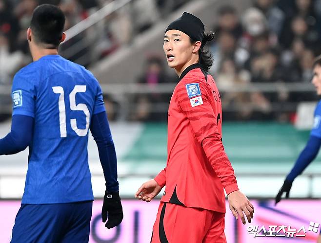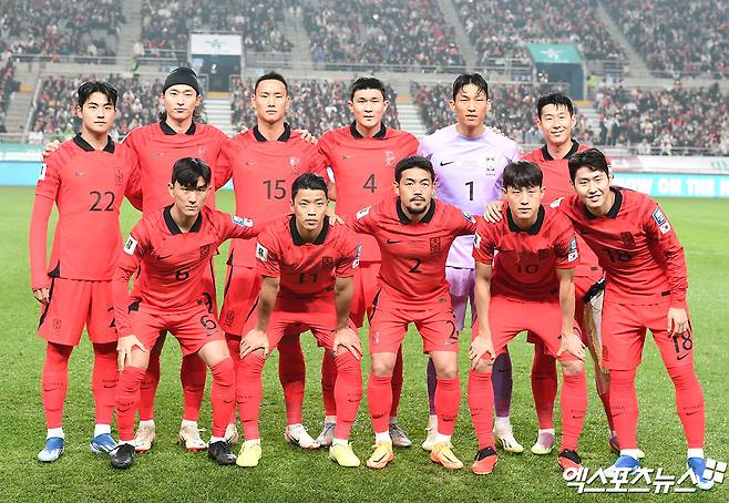김승규(알 샤바브) 골키퍼가 골문 앞에 선 가운데 이기제(수원 삼성), 김민재(바이에른 뮌헨), 정승현, 설영우(이상 울산 현대)가 백4를 구축했다. 중원엔 황인범(츠르베나 즈베즈다)이 혼자 수비형 미드필더를 맡아 클린스만호가 이날 공격적으로 나설 것임을 알렸다. 이재성(마인츠), 황희찬(울버햄프턴), 이강인(PSG), 손흥민(토트넘)이 2선에 포진한다. 머리에 검은색 두건을 쓴 조규성(미트윌란)이 전방 원톱으로 출격했다.