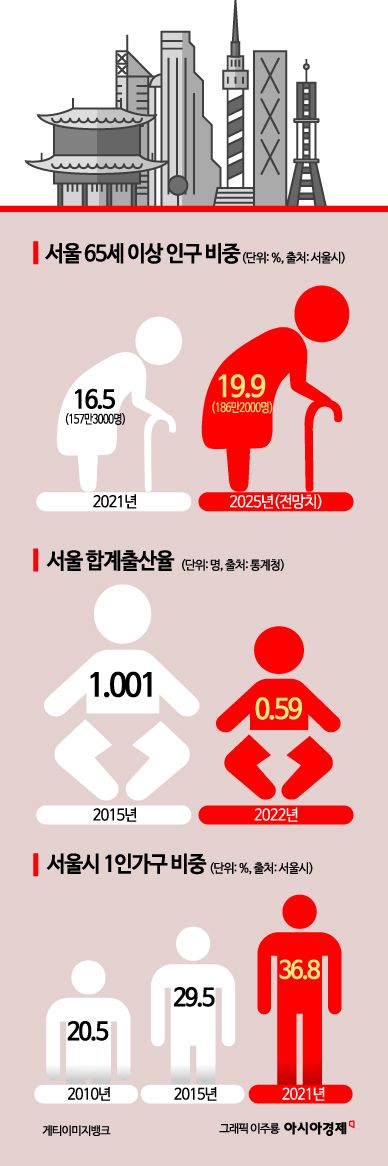 서울은 현재 기존에 경험하지 못한 급속한 인구구조 변화에 직면했다. 2025년이면 65세 이상 인구가 20%를 넘어서는 초고령사회로 진입한다. 서울의 합계출산율은 지난해 0.59명으로, 세계 최저 수준인 한국에서도 저출산이 가장 심각하다. 반대로 평균수명은 높아지면서 빠른 속도로 고령화가 진행됐다.