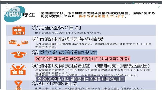 오이타현의 건설회사 헤이와건설도 올 봄 대졸 신입사원을 대상으로 총 상환액의 50%까지 최대 250만엔을 대신 갚아주는 제도를 마련했다. 이 회사가 제도를 도입한 이유 역시 "대졸 구직자들이 우리 회사를 바라만 봐 주신다면.."이다.
