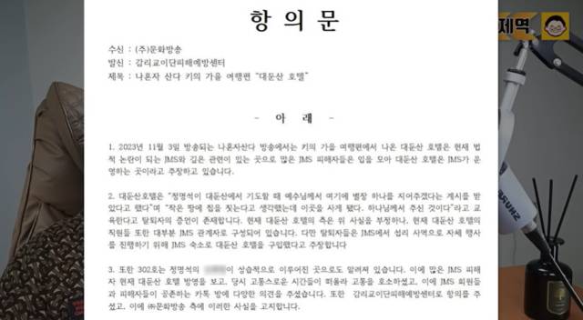 실제로 '나혼산' 방송 이후 감리교이단피해예방센터 측이 JMS와 A호텔의 연관성을 증언하는 항의문을 MBC에 보냈다.