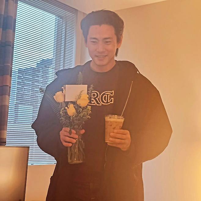 사진에는 니키리의 시선에서 본 유태오의 모습이 담겼다. 유태오는 니키리를 위해 준비한듯 한 손에는 꽃병을, 한 손에는 아이스라떼를 들고 있다.